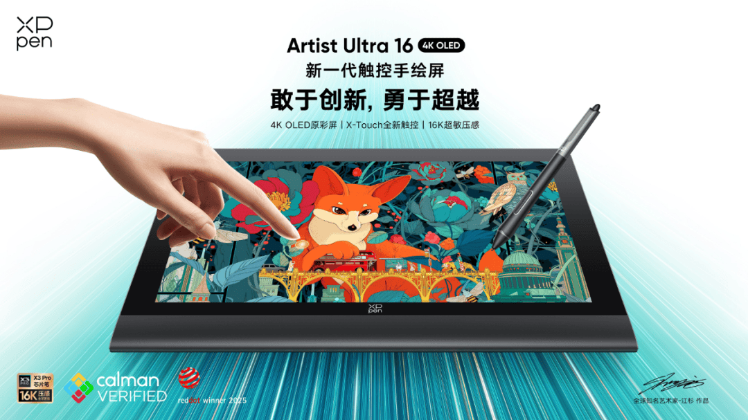 作为全球EMR带芯手写方案领导者,汉王友基始终秉持“以用户为中心”的设计理念,将人体工学设计、现代美学表达与技术创新深度融合,形成“需求洞察-设计研发-场景适配”的完整创新链条。旗下自主品牌多款产品斩获德国iF设计奖、日本优良设计奖、当代好设计奖等国际权威奖项。例如近期荣获"2025红点产品设计大奖"的XPPen Artist Ultra 16新一代触控手绘屏,采用铝合金背板与无边框形态,在确保稳定性的同时实现轻薄便携,打破"专业设备必厚重"的行业定式;并以符合人体工学的快捷键与一体式掌托设计,让专业创作突破空间限制,真正实现了随时随地可开启的创作自由。